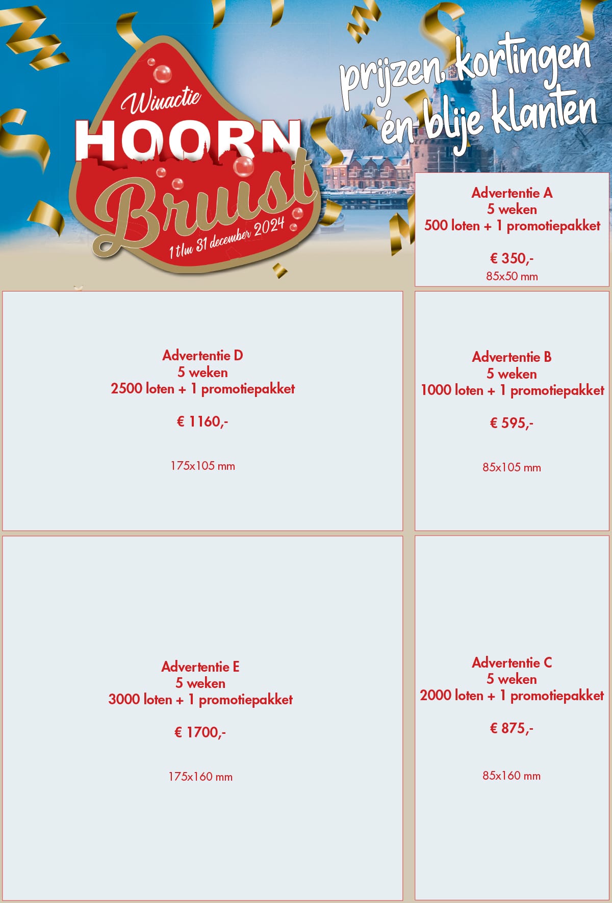 Meedoen aan Hoorn Bruist 2024 kan al vanaf € 350,- U krijgt dan in alle decemberuitgaven van Weekblad Zondag een advertentie, voldoende loten en een promotiepakket voor in de winkel. Bovendien wordt u ook vermeld op de hoornbruist.nl met een doorlink naar uw eigen site, dat is interessant want er zullen tienduizenden mensen in december hoornbruist.nl bezoeken.